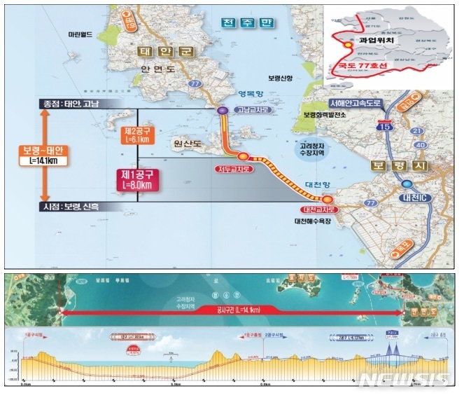 이처럼 보령해저터널이 개통함으로써 국도 77호선 보령~태안 전 구간(14.4km)의 차량 운행이 가능해졌습니다. 국도 77호선 마지막 퍼즐이 맞춰짐으로써 부산-파주까지 남해,서해,한강을 거치는 해안국도가 완성되었습니다.